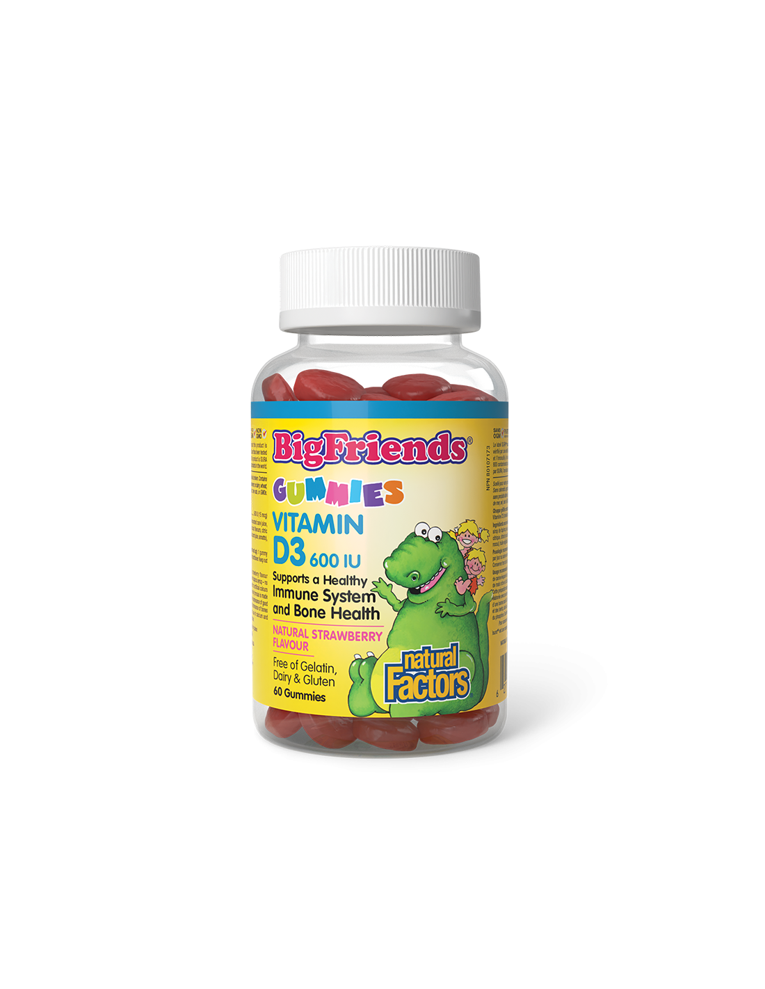 Витамин D3 гъми за деца 600 IU от серията Big Friends на канадската компания Natural Factor e висококачествен източник на витамин D, под формата на лесни за прием желирани таблетки с вкус на ягода.