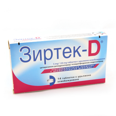 Зиртек-D е противоалергично средство с бързо действие, формула за облекчаване на хората, страдащи от алергии с респираторен характер. Zyrtec-D принадлежи към групата на така наречените антихистаминови препарати, като потиска „ранната“ фаза на алергичната реакция и намалява миграцията (придвижването) на клетките, участващи във възпалителната реакция и отделянето на определени вещества (медиатори), свързани със „забавената“ алергична реакция. Предназначен за лечение на симптомите на сезонен и целогодишен алергичен ринит, като запушване на носа, кихане, ринорея (отделяне на секрет от носа), сърбеж на носа и очите. Благодарение на формулата с удължено освобождаване на активните съставки, осигурява до 24 часа облекчение на симптомите на алергия и Ви дава свободата да се върнете отново към нормалния си ритъм на живот. Противоалергично средство с деконгестантно действие. Под формата на таблетки с удължено освобождаване. ​Продължително действие – до 24 часа. За възрастни и деца над 12 години. Предлага се в опаковка от 14 таблетки.