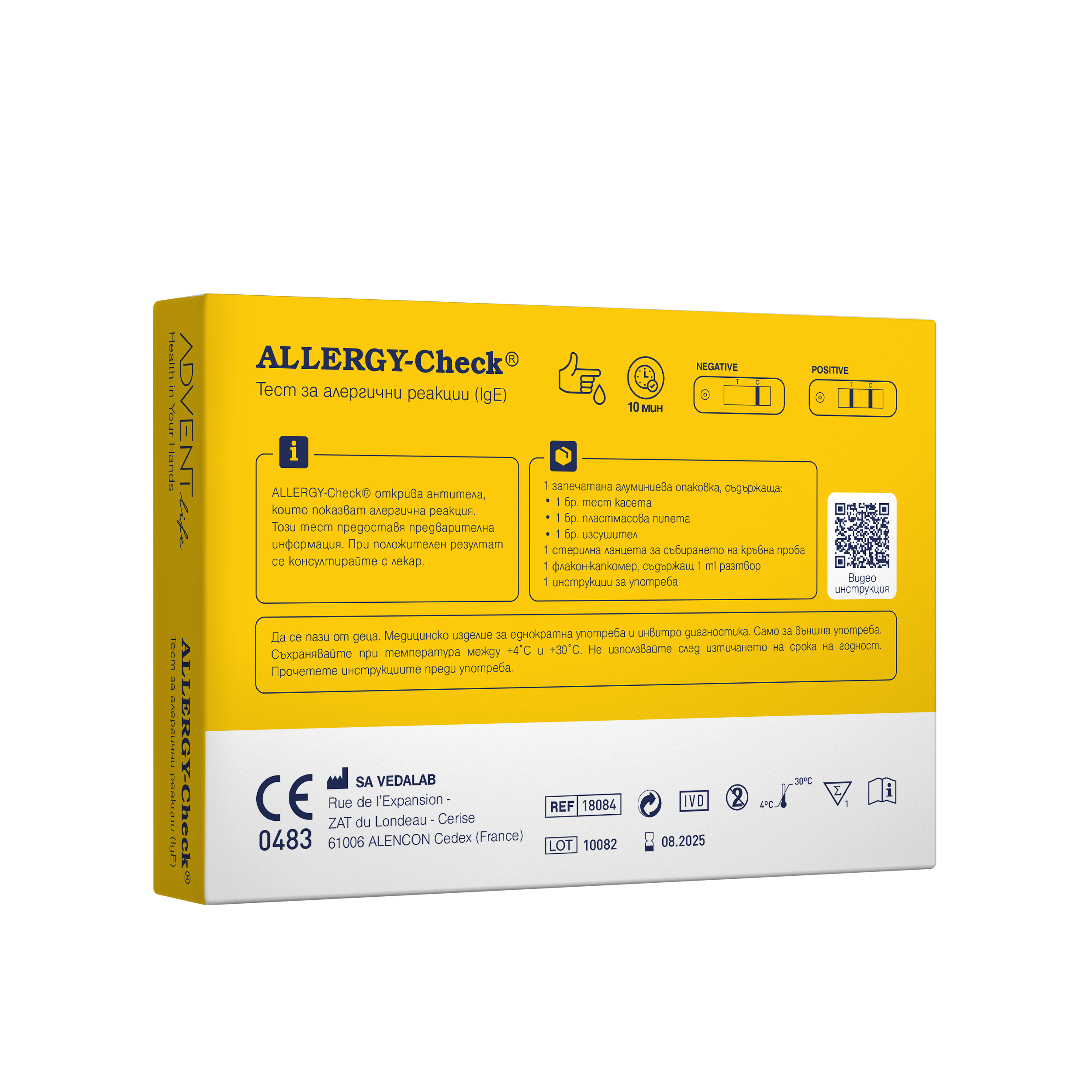 Allergy-Check® е скринингов имунодиагностичен тест за домашна употреба, който отчита повишено ниво на IgE в кръвна проба от пръста. Резултатът показва общата алергична чувствителност и може да насочи към по-нататъшни изследвания.