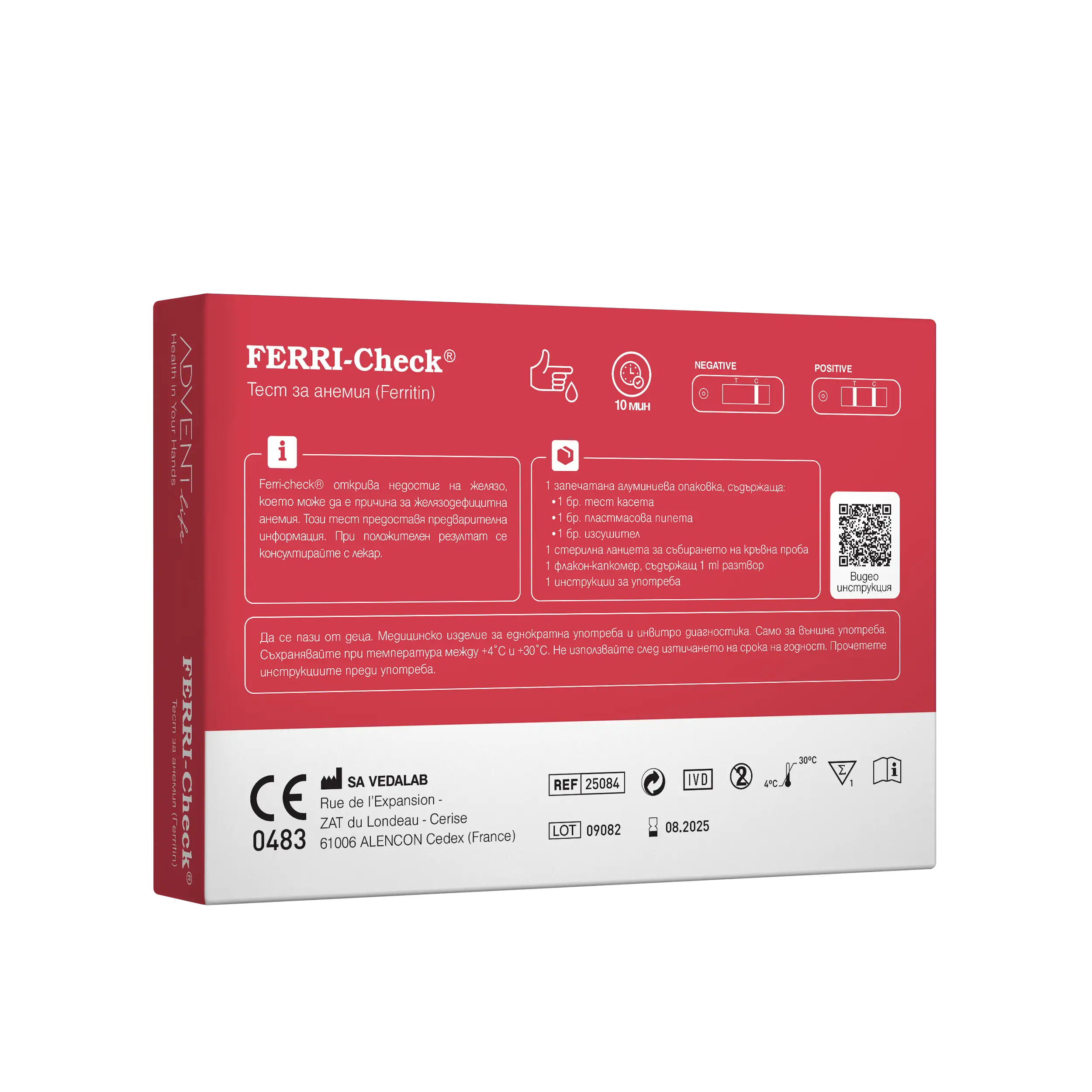 Ferri-Check® е бърз имунодиагностичен тест за домашна употреба, който измерва нивото на феритин – основният индикатор за запасите от желязо в организма. С помощта на капка кръв от пръста и включените в комплекта компоненти, тестът дава резултат само за 10 минути.