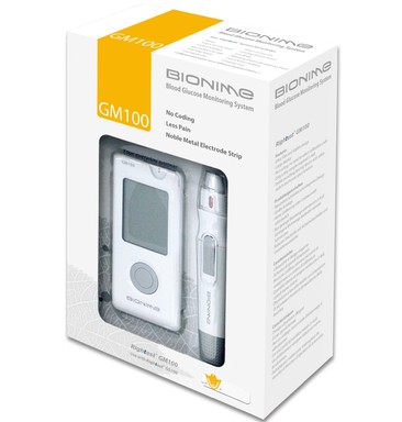 Създаден със швейцарски дизайн и гаранция от 8 години, глюкомерът Бионайм GM100 отговаря на най-стриктните изисквания за точност и прецизност при измерване на високи и ниски нива на кръвна захар (DIN EN ISO 15197:2913). Работи с тест ленти GS100 и притежава технология No-coding (БЕЗ код и не изисква въвеждане). С тънък дизайн и голям дисплей, който позволява добра видимост, дори и от хора със слабо зрение. Глюкомерът е с памет от 150 резултата, с дата и час и с изчислена средна стойност на кръвна захар за 1, 7, 14 и 30 дни, както и батерия модел CR 20132, която осигурява над 1000 точни измервания при нормално използване. Предлага се в опаковка от 1 брой.