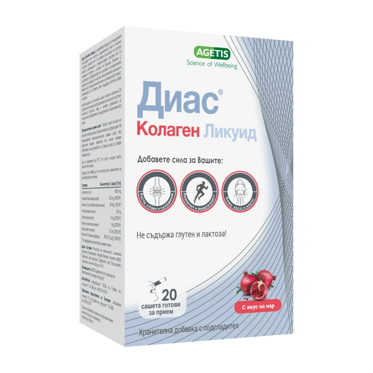ДИАС КОЛАГЕН ликуид саше е иновативен продукт за поддържане на здрави кости, мускули, съединителна тъкан и имунна система.