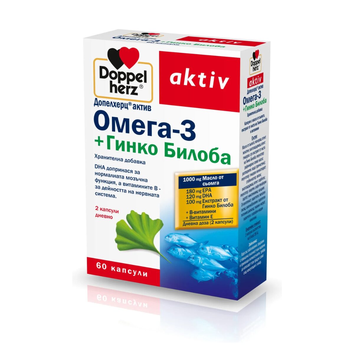 Капсулите Допелхерц Актив Омега 3 + Гинко Билоба съдържат специална комбинация от Омега-3 мастни киселини (EPA и DHA), екстракт от листа на Гинко Билоба, витамини от група B и витамин E.