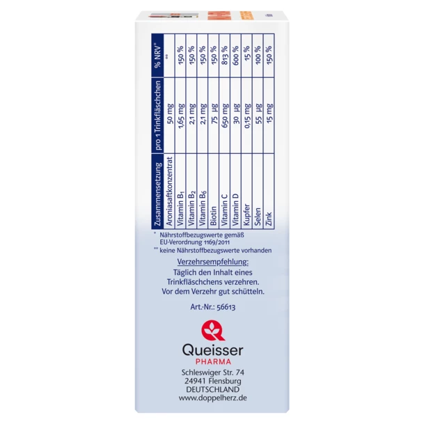 Aдекватното снабдяване с хранителни вещества е важно, за да бъде имунната ни система здрава и силна. Благодарение на специално разработения индивидуален флакон, Допелхерц систем Имун + Арония комбинира високата доза от 500 mg витамин С с концентрат на сок от арония, като допринася за запазване на нормалната функция на имунната система.