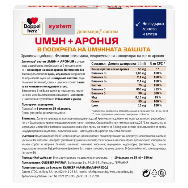 - Допелхерц Систем Имун е с добавени концентрати на сок от арония, портокал и червено грозде