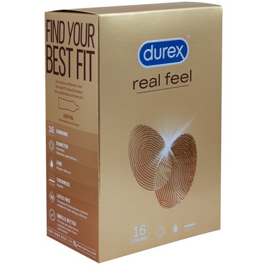 Durex Real Feel са прозрачни, с лубрикант и завършващи с резервоар. Имат номинална ширина от 56 мм. Eлектронно и дерматологично тествани. Предлагат се в опаковка от 16 броя.