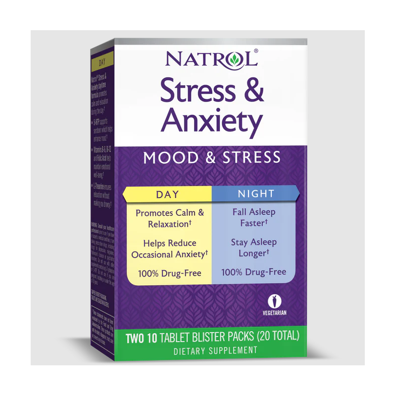 За да се преборим успешно в работата, със семейните ангажименти, лични и професионални проблеми имаме нужда от спокойствие, а то се крие в една доза от продукта Natrol Стрес и Безпокойство. Таблетките Natrol Стрес и Безпокойство са представени в двойна опаковка, която предлага дневна и нощна формула. С дневната доза от продукта, може да преборите напрежението, да върнете позитивното мислене и да се фокусирате върху важните за вас неща. Дневна доза Natrol Стрес и Безпокойство предлага микс от витамини от група В, в комбинация с 5-НТР. Чрез нощната формула на Natrol Стрес и Безпокойство може да доставите на организма така важните му валериан, калций, екстракт от гроздово семе, мелатонин и L-глутамин, за да осигурите оптимално ефективна релаксация и здрав сън на тялото си.