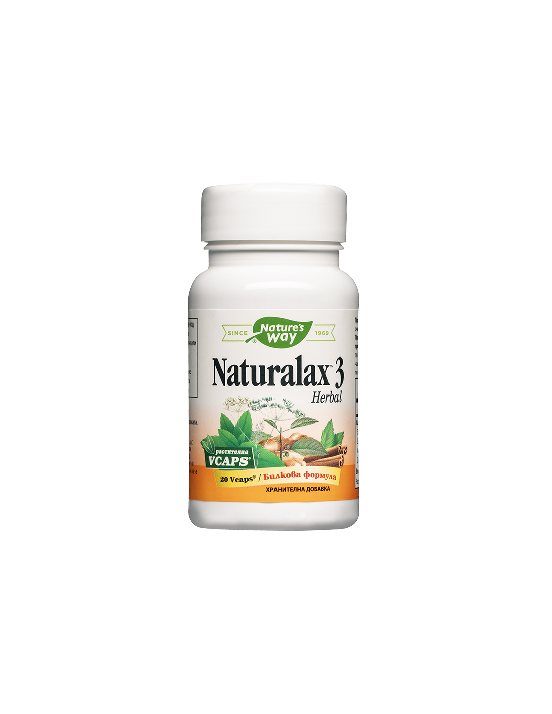 Натуралакс 3 е патентован продукт на Nature’s Way, който съдържа алое вера (латекс и лист), кора от американски орех, семена от копър, джинджифил, екстракт от американски зърнастец, листа от малина, листа от мента. Има слабително и очистително действие.