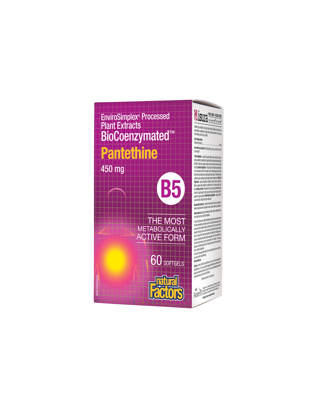 Пантетин (Витамин B5) на Natural Factors е иновативна формула, която осигурява 450 mg биоактивна коензимна форма на витамин B5, в комбинация с Farm Fresh Factors ™, биоенергична смес от фитонутриенти, за директна подкрепа на липидния метаболизъм и за понижаване на общото ниво и нивата на LDL холестерола.