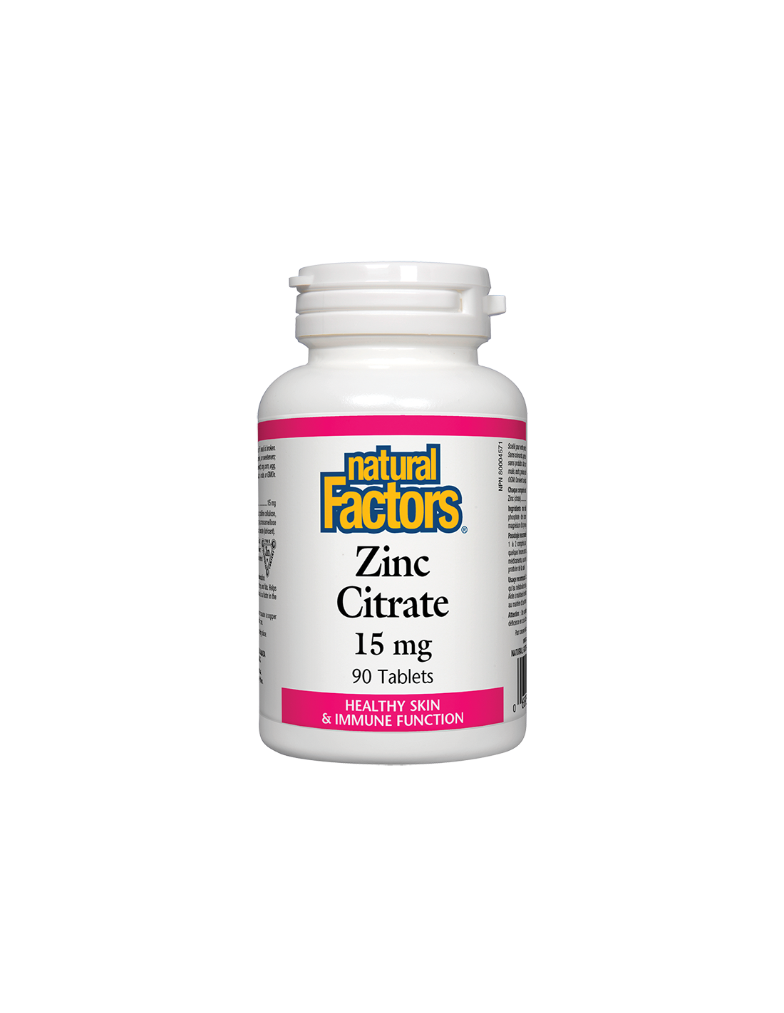 Таблетките с цинков цитрат на Natural Factors съдържат 15 мг от този важен микроелемент. Цинкът подпомага естествената защита на организма и е жизненоважен за здравата кожа. Той е необходим за много хормони и подпомага здравето на репродуктивната система, по тази причина намира широко приложение за нормалното функциониране на простатата. Цинкът е необходим за сетивата ни за мирис, вкус и зрение. Цинковият цитрат е отлична форма на цинк, тъй като цитратите се абсорбират много добре и се усвояват от тялото.